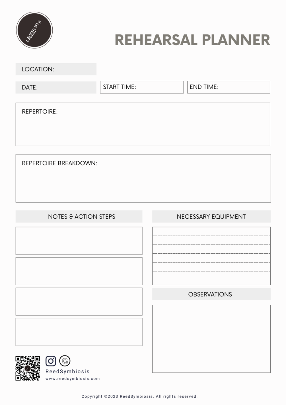 A practical rehearsal planner for specific or incidental rehearsals. Optimize your rehearsals with a Rehearsal Planner. This practical tool provides a structured format for planning rehearsals, ensuring enhanced organization and productivity. Stay on top of rehearsal dates, track locations, and break down your practice sessions effectively with the Rehearsal Planner.
